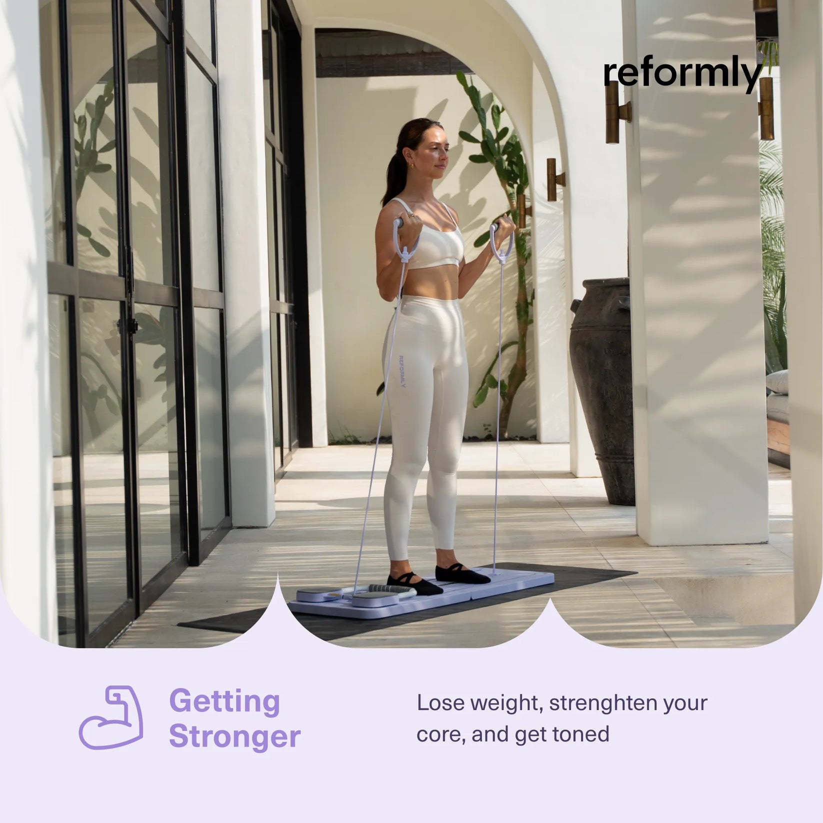Offers Reformer-style workouts right at home—without the bulk or cost of a full machine. -